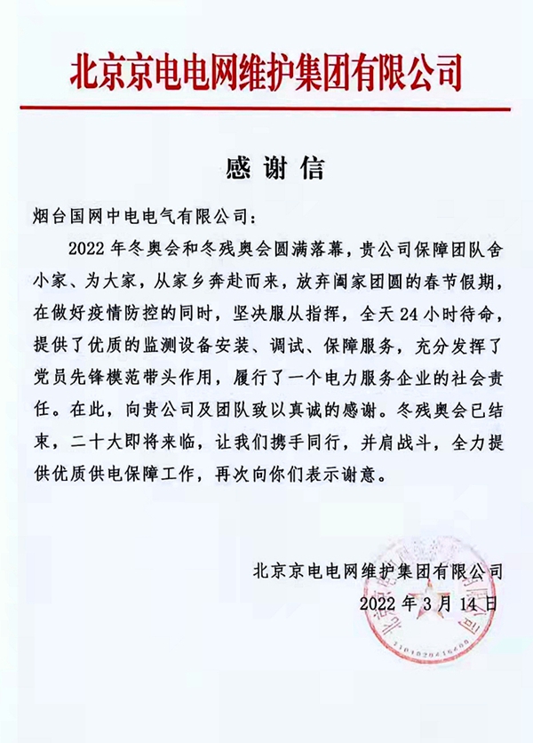 截至目前共有股份公司收到来自国网北京市电力公司、国网天津市电力分公司、国网冀北电力有限公司张家口供电公司、国网冀北廊坊供电公司的感谢信;威思顿公司收到来自国网冀北电力有限公司张家口供电公司的感谢信;国网中电公司收到来自国网冀北电力有限公司张家口供电公司的感谢信;玉麟公司收到来自中铁二局集团有限公司的感谢信。